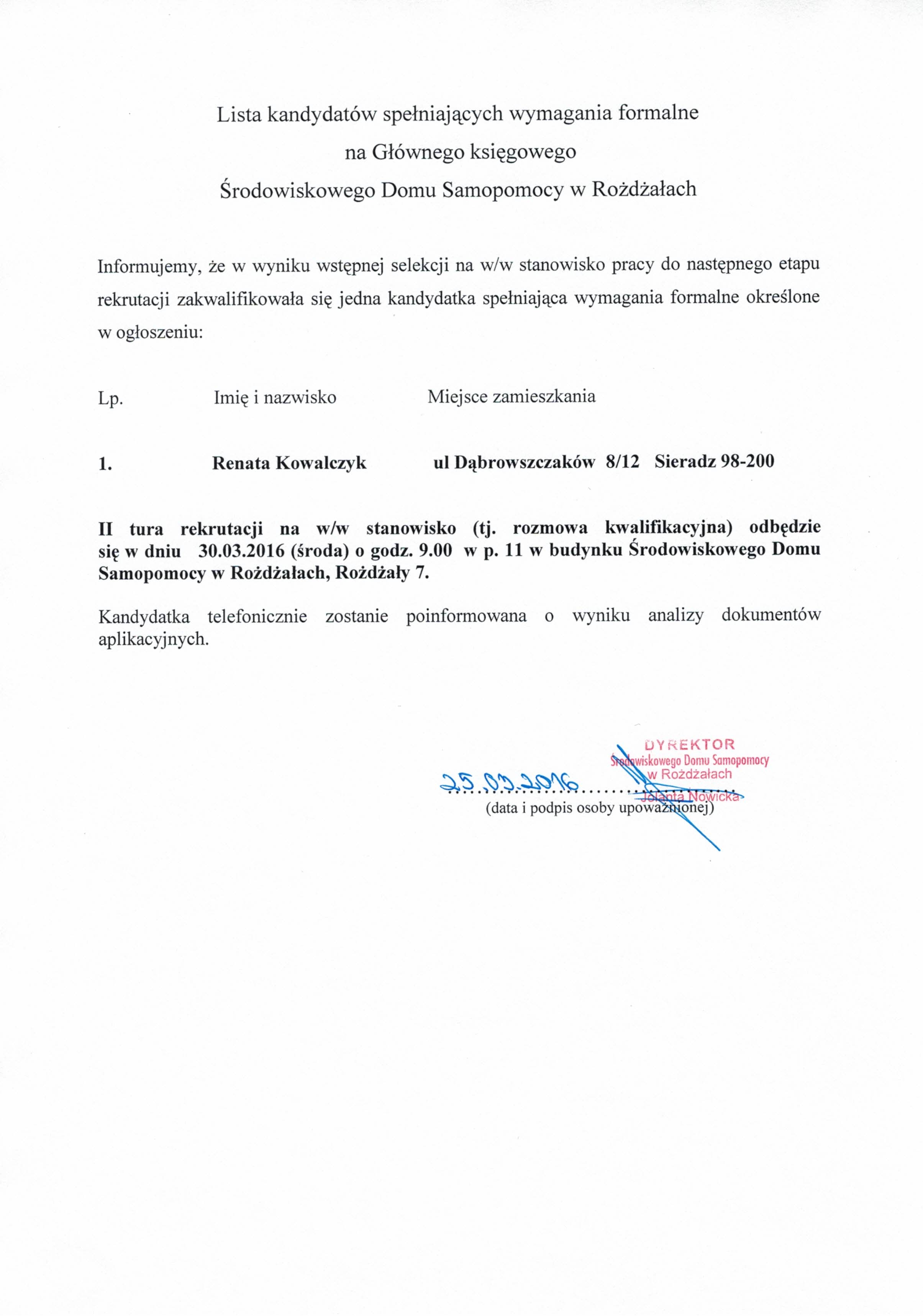 Lista kandydatów spełniajacych wymagania formalne na Głównego księgowego Środowiskowego Domu Samopomocy w Rożdżałach